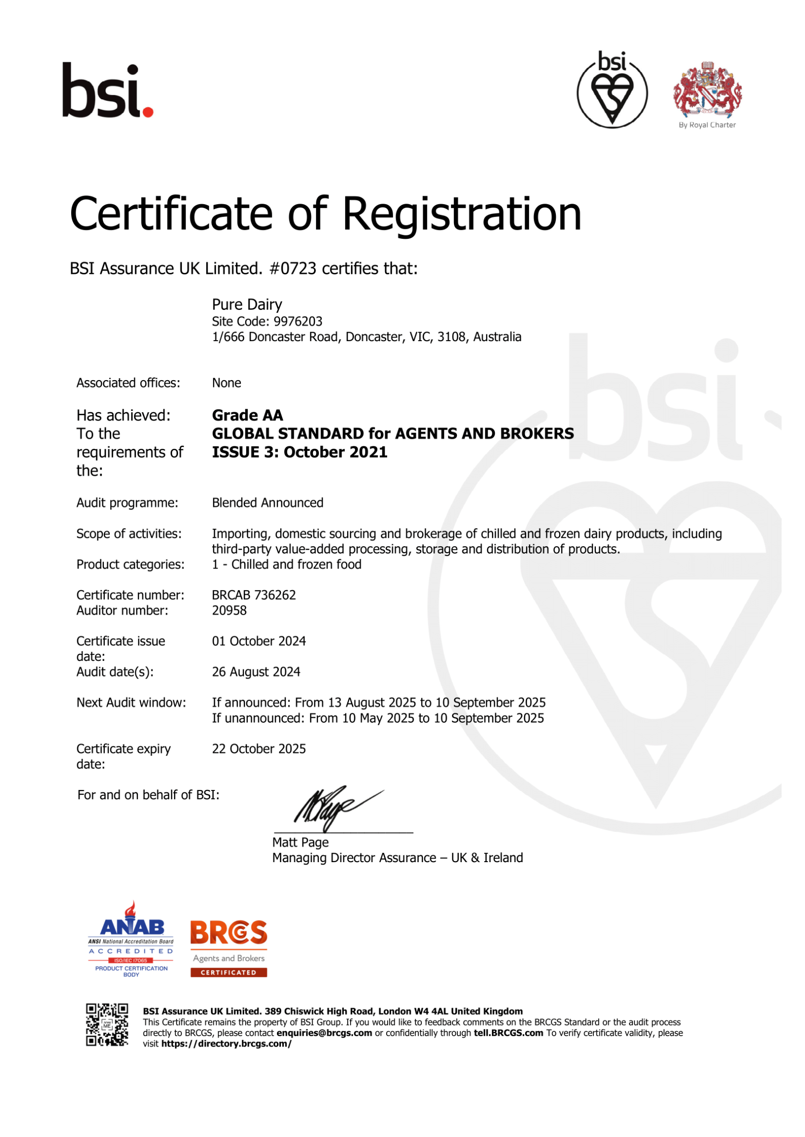 If you are a specifier, you will be pleased to know that Pure Dairy has been certified as per the BRCGS Global Standard for Food Safety. This is the leading standard of the Global Food Safety Initiative (GFSI) scheme, with supply-chain resilience and transparency achieved through the Food Safety Standard and registered on the BRCGS Directory.